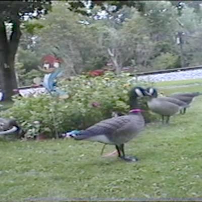 Lawn ornament duck "gives birth" to a bunny, who crawls out of a hole in its bottom