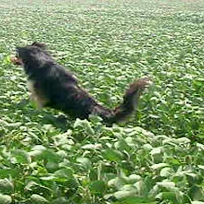 A Collie dog hopes through a field like a rabbit. Action :09-:13.
