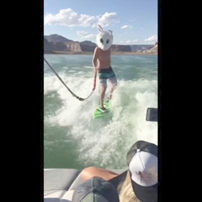 A young man wake boards behind a boat with a rope and has a bunny rabbit mask on. The man swings the rope in circles and it knocks an iPhone phone from a young woman's hands into the water.