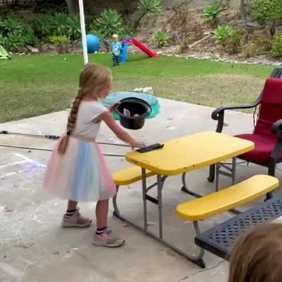 A young girl holds a top hat with a rabbit in it and says "you see it" and sticks a black cloth in the hat and says "you don't see it!" and her family laughs in the backyard.