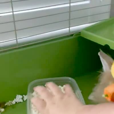 A rabbit in a cage outside eats from a bowl and doesn't realize she's sitting on a baby rabbit. The baby rabbit flails and struggles to get free.