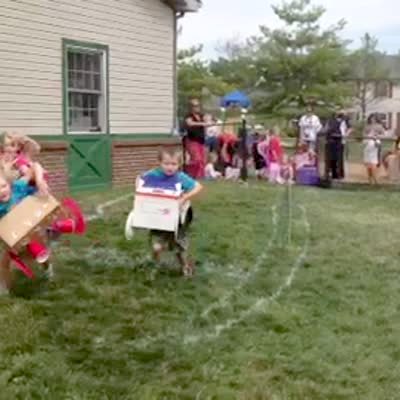 Kids race outdoors in cardboard cars. A little girl falls over, crashing her home made car.