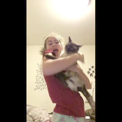 A girl holds up a cat and talks to the camera in the bedroom and the cat scratches her face and she drops it.