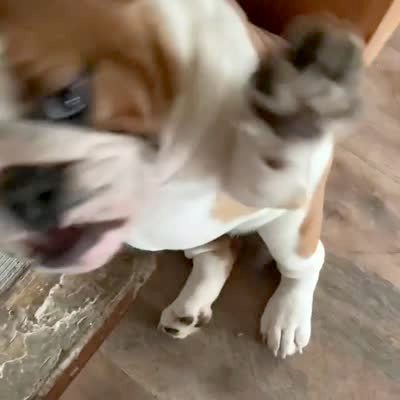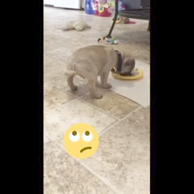A puppy dog's hind legs raise in the air and it flips over while it eats off a plate on the floor. Emoji added to video.