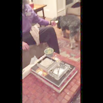 A dog knocks over a cup of soup on a table in the living room when a man tells him to raise his paw for a cracker.
