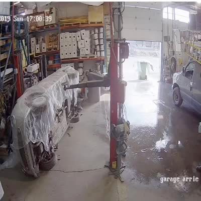 A man raises a Nissan Figaro car in a garage into the air with a lift and the car falls and the man jumps out of the way.