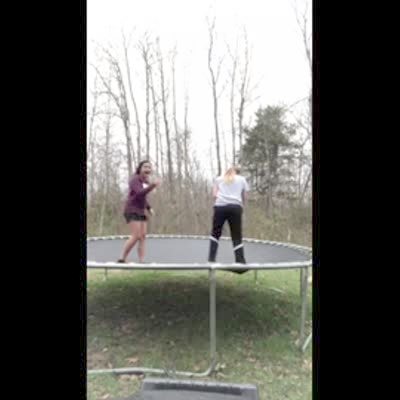 Two teen girls raise a younger girl up above them on a trampoline in the yard. She loses balance and falls and then bounces on the trampoline and goes off the edge.