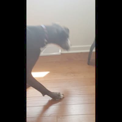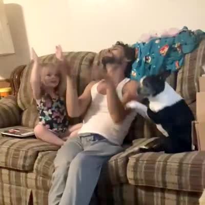 A Boston Terrier mimics a man and a tot girl as it lifts his paws up and down and "raises the roof."