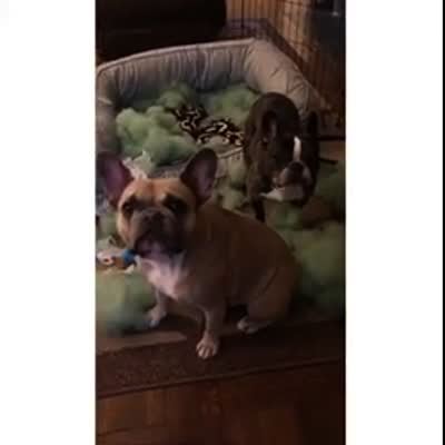 A woman asks her French Bulldog dogs who is responsible for the mess in their bed and one dog raises his paw.