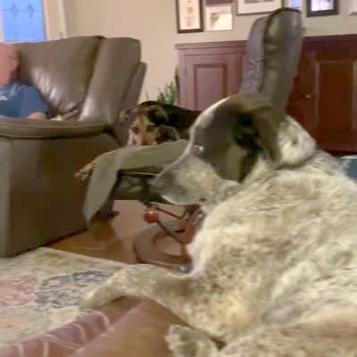 A man off camera and behind a doorway lifts a dog with balloons attached to her to create the impression she's floating.
