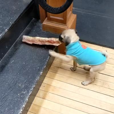 A pug puppy dog struggles to carry a large toy up the stairs in the house. A man comments that it won't work, then the pug raises the treat and goes up the stairs.