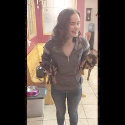 A teen girl holds two puppy dogs in her hands in the kitchen and whenever she brings them close together, they start to bark at each other. Twin dogs
