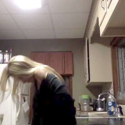 A teen girl dances in the kitchen and leans against the oven and holds onto the door while she puts her legs up on the counter. The oven door opens and she falls to the floor.