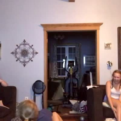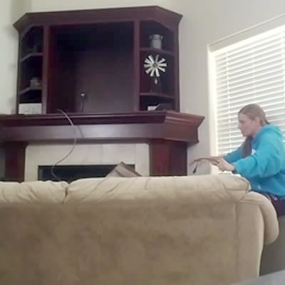 A teen girl attempts to practice her cheer routine in a bedroom, when she raises her megaphone up and hits the ceiling fan light fixture, shattering it.