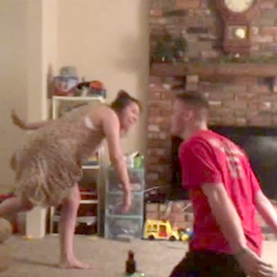 A woman runs and jumps at a man as he lifts her up in the living room to recreate the scene from "Dirty Dancing" and they lean too far back and he drops her.
