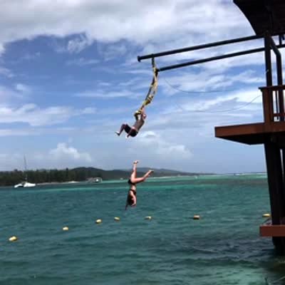 A woman flips backwards in to the water at the beach after she jumps off of a raised pier and grabs a rope, then loses her grip.