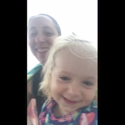 A woman asks a little girl what face she makes when she's in trouble and she lowers her head down and raises her eyebrows in a bathroom.