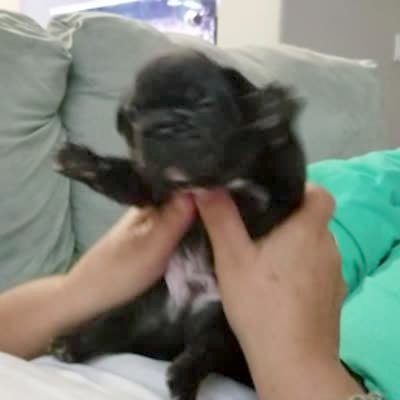 A puppy dog raises its paws in the air when a woman lifts it up.