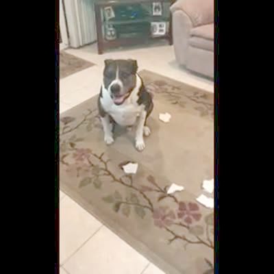 A woman asks her dog who made a mess of paper on the living room floor and the dog raises its paw and barks.