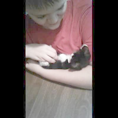 A kitten cat raises its paws in surrender whenever a boy points a finger gun at it and tells it to "stick 'em up."