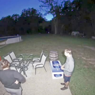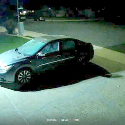 A man walks out into the driveway to pick something up and then walks back to the garage, but hits his face on the door because it's not up all the way. Home security camera. No audio.