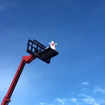 A snowman sits on the platform of a construction vehicle that's raised high up into the air outdoors. A person tilts the platform and the snowman falls and gets destroyed when it hits the ground.