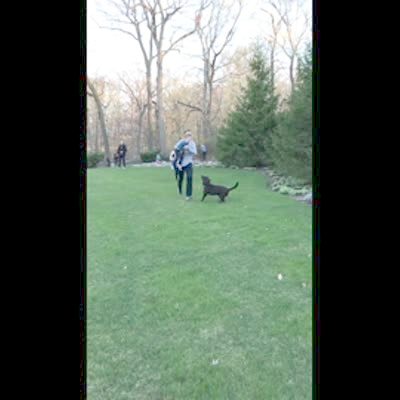 A tot girl runs to an easter egg in a backyard and tries to pick it up while a man pulls it on a string to keep it out of reach. The girl repeatedly says, "Come to me" as the man raises and lowers the egg, then another tot girl tries to help but can't grab the egg either.
