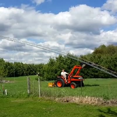 A man tries to raise a large antenna with a construction vehicle and the antenna bends in half.