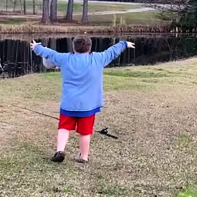 A young boy sticks his arms out and approaches a goose bird by a pond, but then it takes a step towards him and he screams and runs away. He starts crying and says "He's gonna kill me."