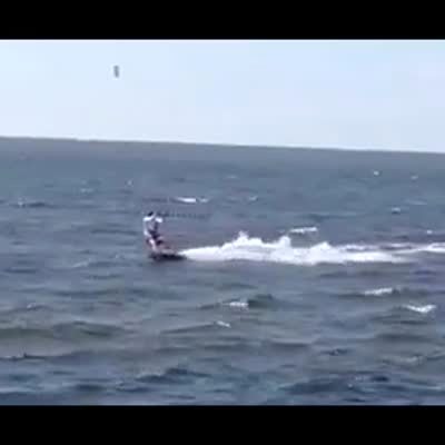 A man kitesurfs on a kiteboard in the ocean and gets raised up and down in and out of the water.