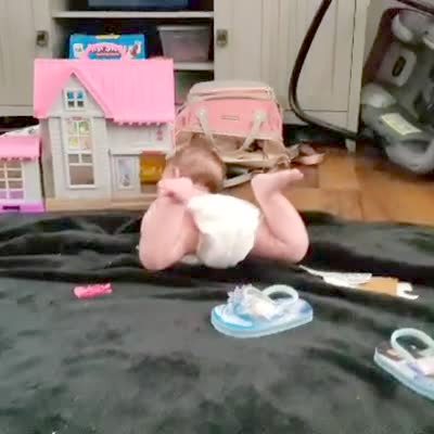 A baby girl leans forward on her chest and raises her back legs and hips off the living room floor.