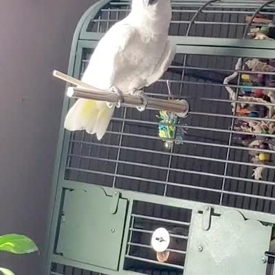 A woman tells a cockatoo bird that she is pretty, and the bird raises her head feathers and bobs up and down until her perch breaks.