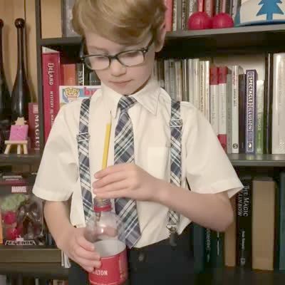 A young boy says that he will do a magic trick with a bottle and a pencil, then he puts the pencil inside an empty bottle and pretends to raise it up with his mind. Then a fog machine releases a cloud of smoke, and he slowly moves down from the camera while music plays. Mind Blowing Magic