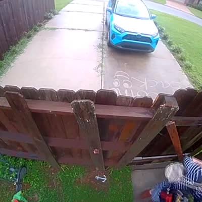 A woman tries to squeeze through her broken wooden gate. The gate is stuck so she forces it and when the gate breaks and falls down she falls with it and into the driveway. She raises her arms in triumph. Security footage. Inappropriate language.