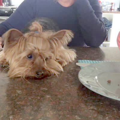 A Yorkie dog lies on a dining table and stares at food as a young girl eats it, and each time he raises his head a woman tells him not to beg and he puts his head back down.
