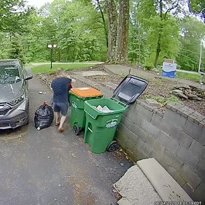 A man puts a bag of trash in a trashcan in the driveway. He picks up a second bag and it rips and all the trash falls on the ground. Home security camera