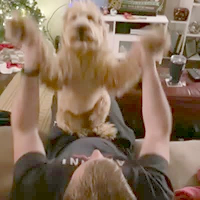 A man calls a Golden doodle dog "Dog-zilla" in the living room, and when he raises its paws the dog opens its mouth.