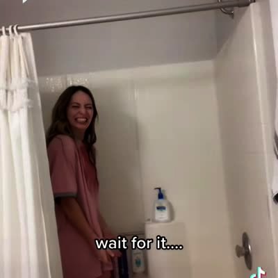 A young woman gets in the shower with her clothes on. She lip syncs to music and raises her arms in the air. When she does the shower curtain falls and so does the woman. Music rights not covered.