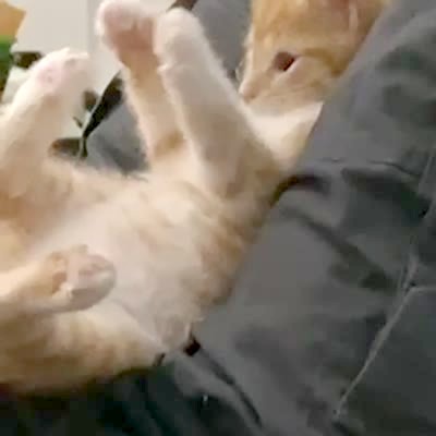 A kitten cat lies on a man's lap on a bed in a bedroom and the man raises his arms and says stick em up and the kitten cat raises its front legs above its head.