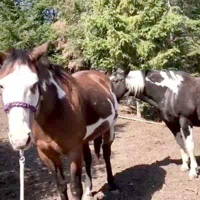 A horse smells another horse's butt then raises its upper lip outdoors.