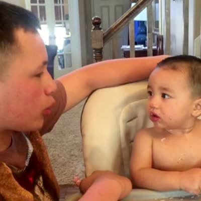 A man beat boxes to a tot boy and each time he stops, the tot boy blows a raspberry.