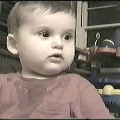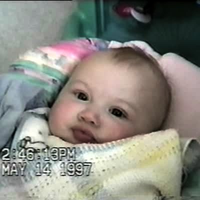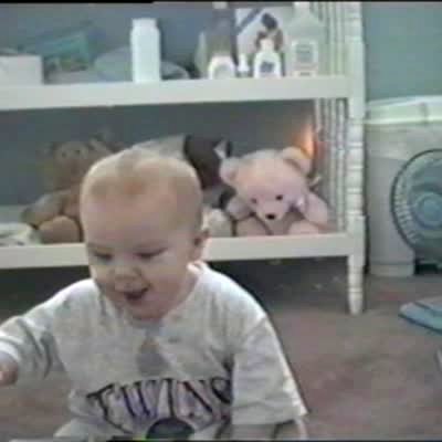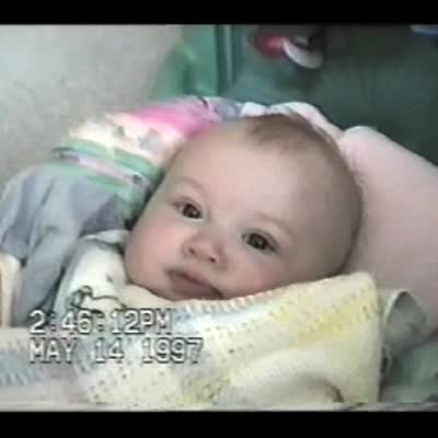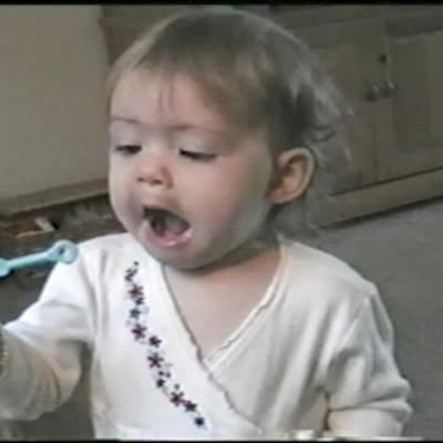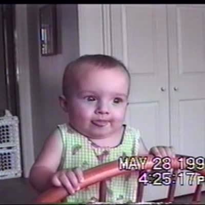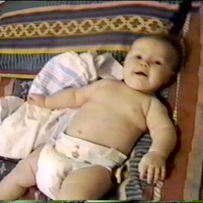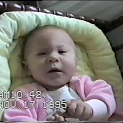 Baby blows many raspberries animatedly close to camera. date on screen 1999 partially covers her face..