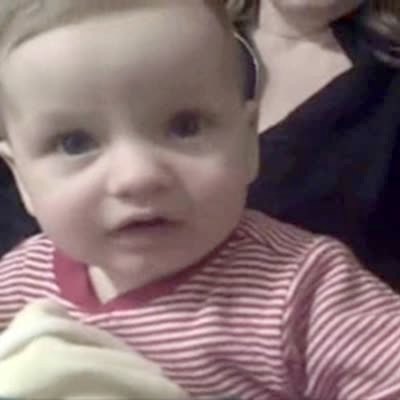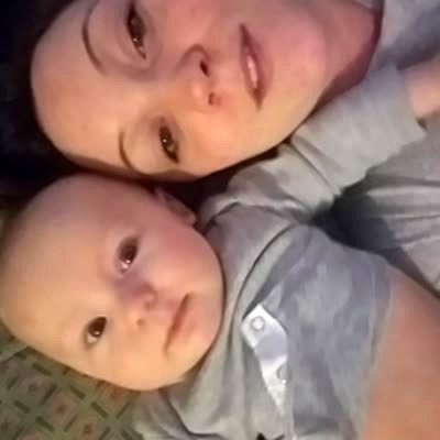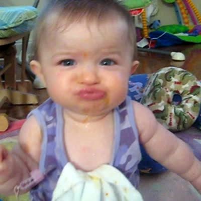 Adult woman blows raspberries. In response baby boy poops his pants.