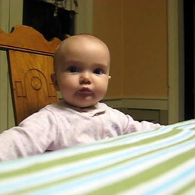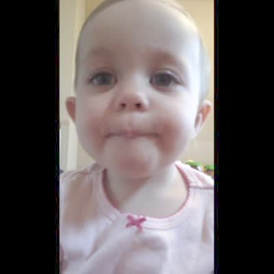 A baby girl sits at a dining table and makes funny noises when the adults behind the camera ask her questions. They ask what sound comes out of a horses butt and she makes a farting noise.