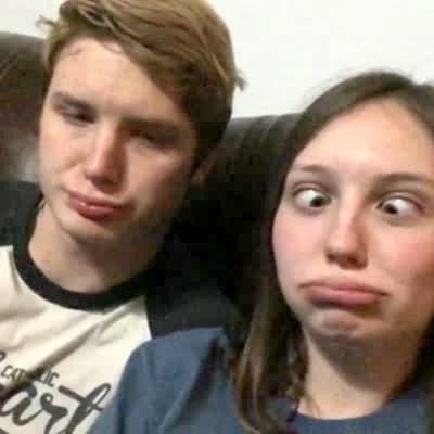 A teen boy and girl make funny faces while blowing raspberries with their mouths in slo-mo. The girl crosses her eyes.
