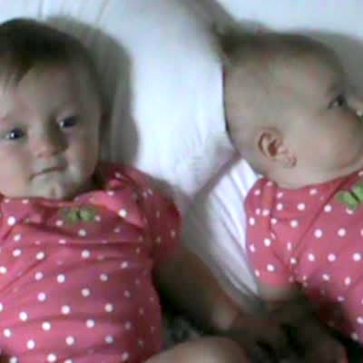 "Raspberry Babies" Two twin baby girls lie on a bed next to each other. One of the baby girls blows raspberries and the other laughs. Very cute.