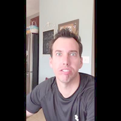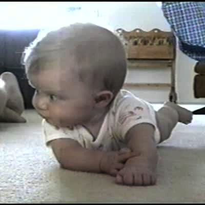 Baby boy sits on the floor & laughs at mom blowing raspberries. The 4th time, he flails around and tips over - terrified of the noise. Scared. Surprise. Baby is fine.