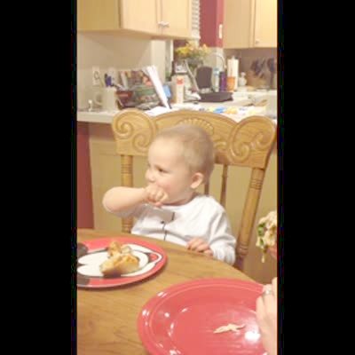 A tot boy blows raspberries on his arm at the dinner table as his family tells him to make bigger ones and he widens his eyes and makes the noise again.