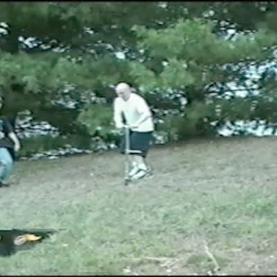 A teen boy rides a razor scooter across playground structures (see-saw) that tip up and hit him in his groin.