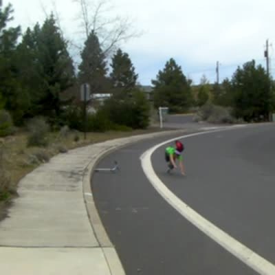 Teen boy rides razor scooter down steep road. Falls off and crashes hard on his face